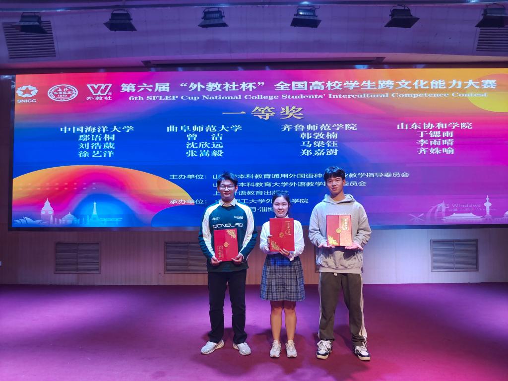 近日,第六届“外教社杯”全国高校学生跨文化能力大赛山东赛区比赛在山东理工大学落下帷幕,由时博网页版页面登录_时博(中国)董伟老师指导,我校学子曾洁、沈欣远、张嵩毅组成的团队在复赛与决赛环节表现出众,荣获山东赛区选拔赛一等奖。