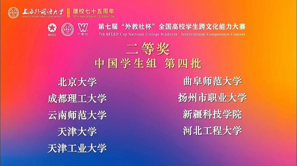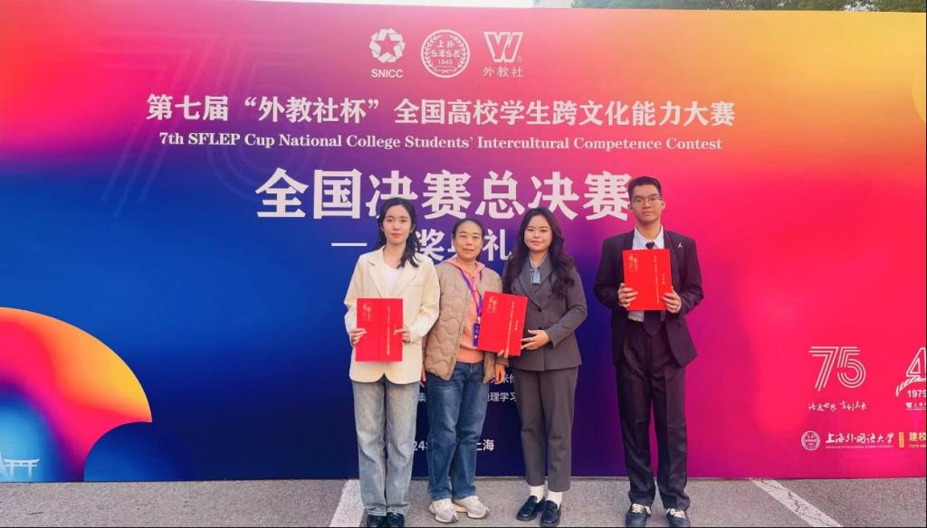 11月28日-12月1日,第七届“外教社杯”全国高校学生跨文化能力大赛在上海外国语大学成功举办。由巩奕含(统计与数据科学学院)、崔又心(统计与数据科学学院)、杨浩然(外国语学院)组成的时博网页版页面登录_时博(中国)代表队荣获全国二等奖,公共外语教学部副教授仲蕾荣获优秀指导教师奖,这是时博网页版页面登录_时博(中国)在该项赛事中首次荣获国家级奖项,取得历史性突破。
