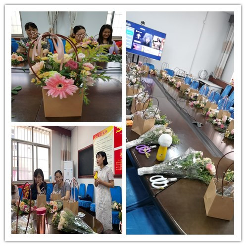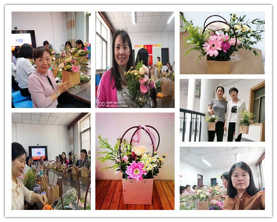 本次活动邀请了济宁市青岫花店总监李燕担任老师。活动伊始,花艺老师向老师们介绍了各类花材的特点和花语寓意,对鲜花养护技巧、插花的基本方法、花型设计等进行了详细讲解,并结合理论知识现场演示插花技巧。随后,老师们在花艺老师的指导下发挥创造力,结合不同的花朵色彩,一步步制作,随着时间的流逝,一件件春意盎然、清新淡雅的插花作品随即盛开在老师们的手中。活动尾声,老师们纷纷手捧自己亲手制作的美丽花束合影留念,为生活增添了靓丽的色彩。