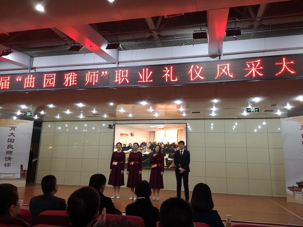 本次大赛分为形象展示、知识竞赛、粉笔板书、即兴演讲、情景模拟五个环节。形象展示环节中,参赛教师们精神饱满、礼仪到位,结合本部特色进行形象设计。