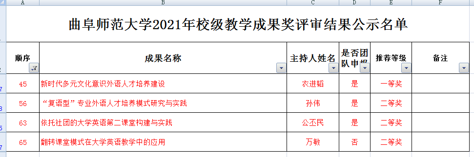 按照山东省教育厅和我校《关于开展2021年校级高等教育教学成果奖评选工作的通知》要求,我校组织了2021年校级教学成果奖评审,经个人申报、学院排序推荐、学校资格审核、初审和专家终审等环节,共评定教学成果奖特等奖22项、一等奖23项、二等奖23项。其中时博网页版页面登录_时博(中国)衣进韬老师获得一等奖,孙伟老师、公丕民老师、万敏老师获得二等奖。