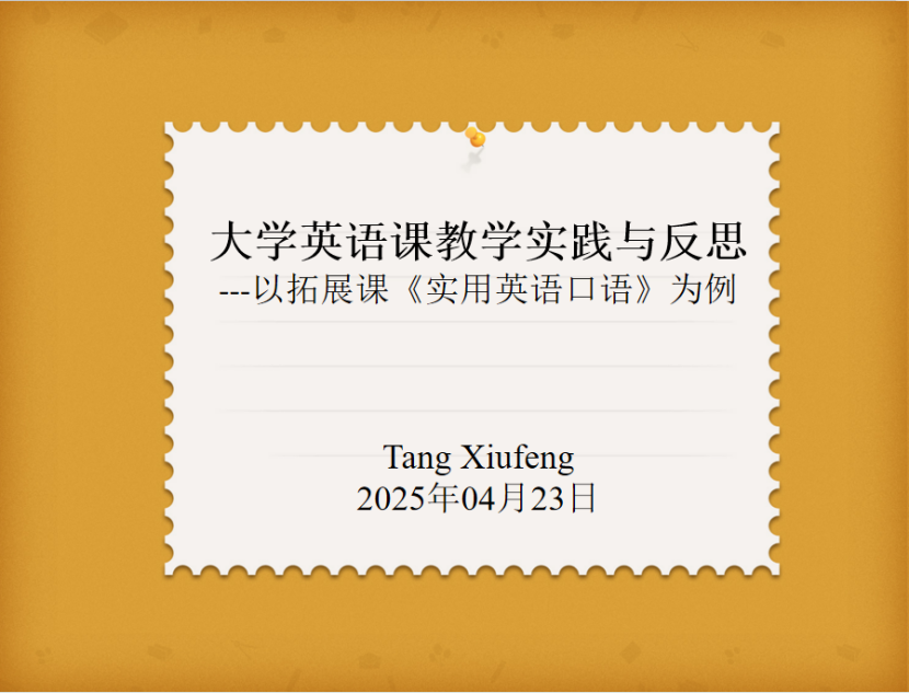 2025年4月23日,公共外语教学部组织全员研训活动,聚焦大学英语教学实践与反思主题。活动中,唐秀峰老师以拓展课《实用英语口语》为例,分享了自己的教学经验与教学反思,为在场教师带来了新思路和新启发。研训中,唐老师从教学准备、课堂管理、技术应用、学生互动和评估反馈等多个关键维度展开分享。